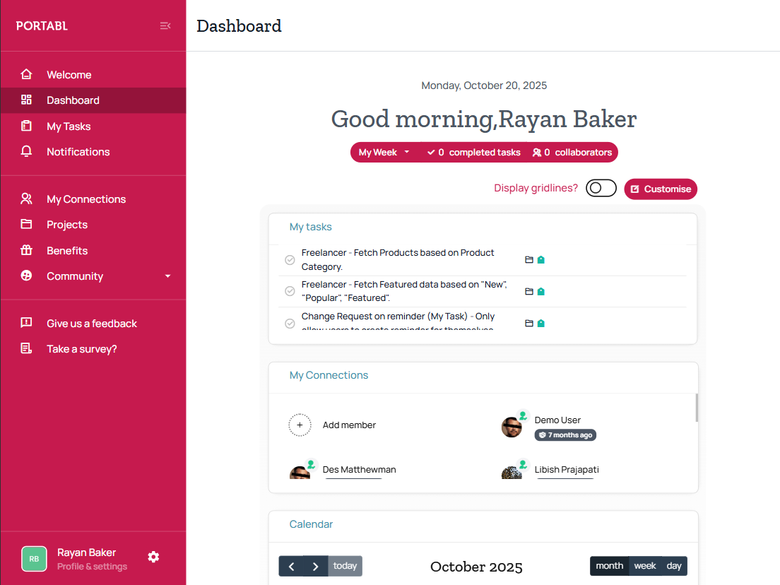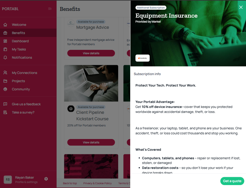 Portabl equips freelancers with insurance, benefits, and tools to manage health, wealth, work, and time efficiently, along with project management features.